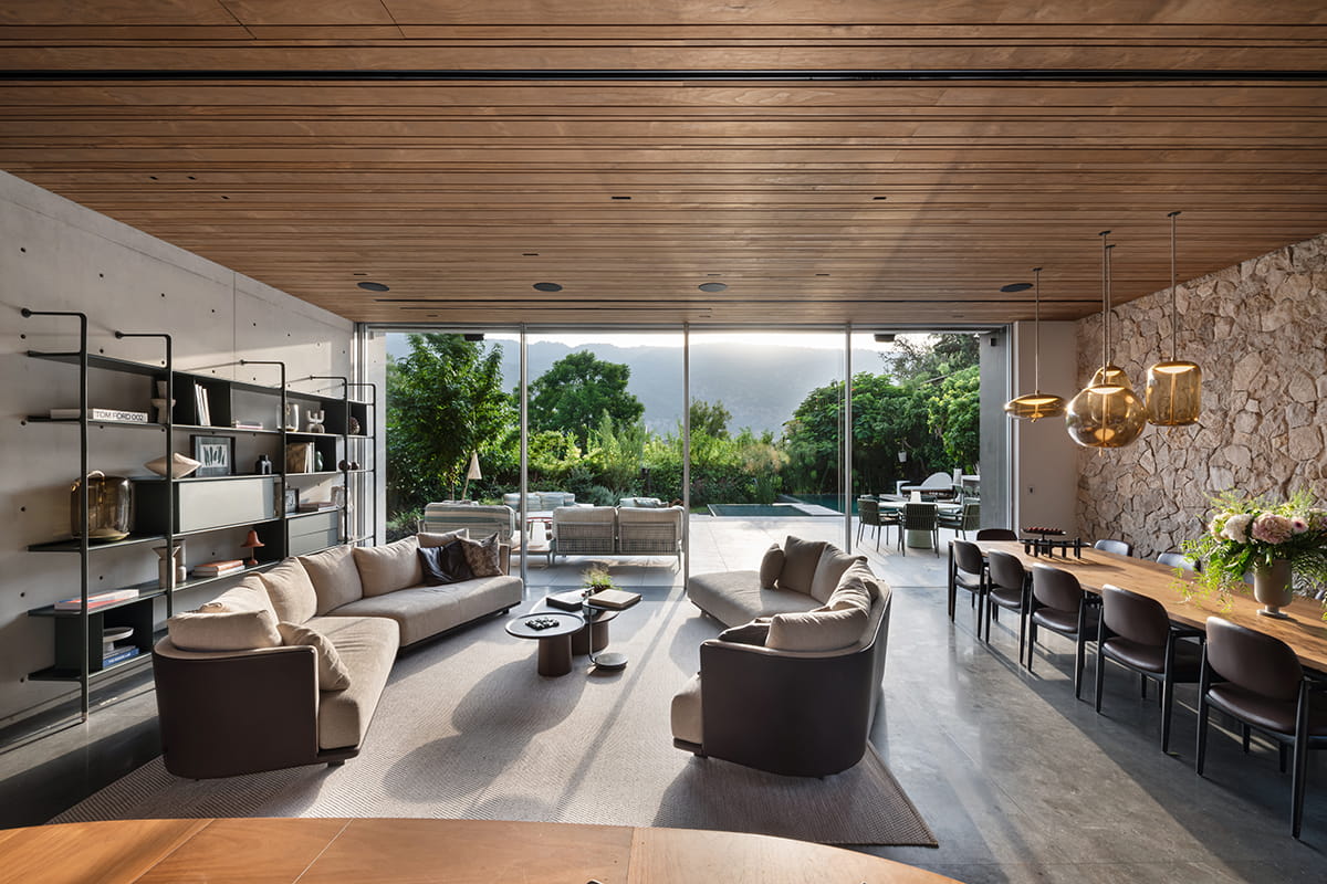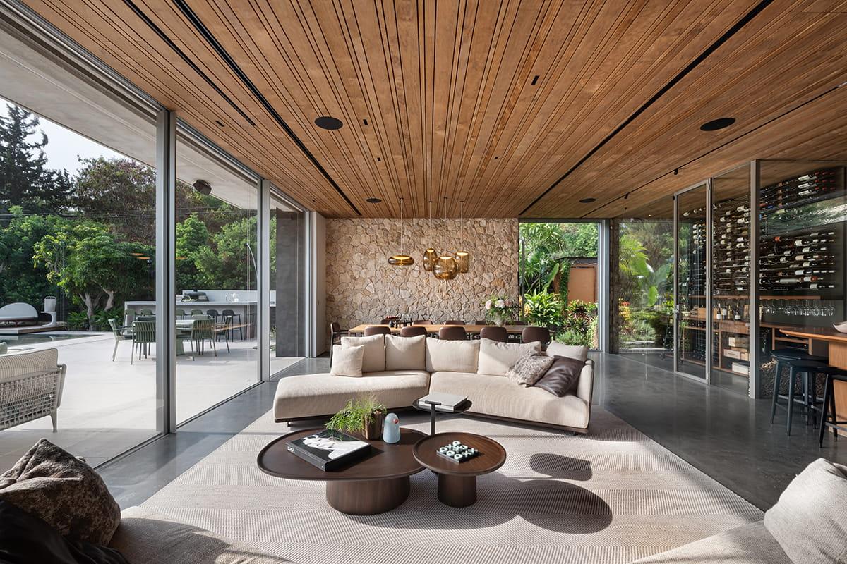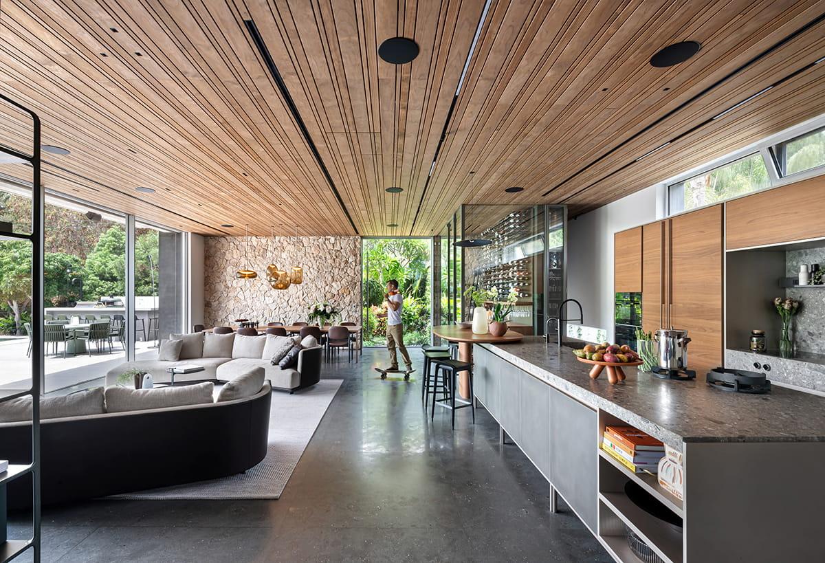 "בית האלמנט", כפי שכונה על-ידי מתכנניו, מעניק הצצה מרהיבה לאופן שבו חומרים טבעיים משתלבים בהרמוניה מושלמת עם הנוף הפתוח והסביבה החיצונית. תקרת העץ הייחודית, הנגלית מכל נקודה בבית, עשויה עץ רדיאטה תרמי במשחק של חתכים משתנים מבית האיכות של Thermory, ותוכננה והותקנה בסטנדרט בלתי מתפשר על-ידי הצוות המדהים של חברת מוגלי.